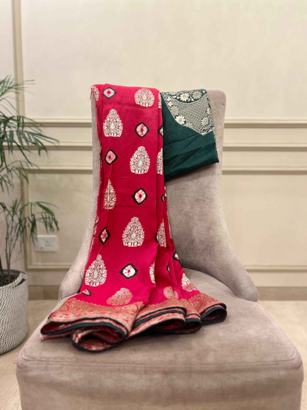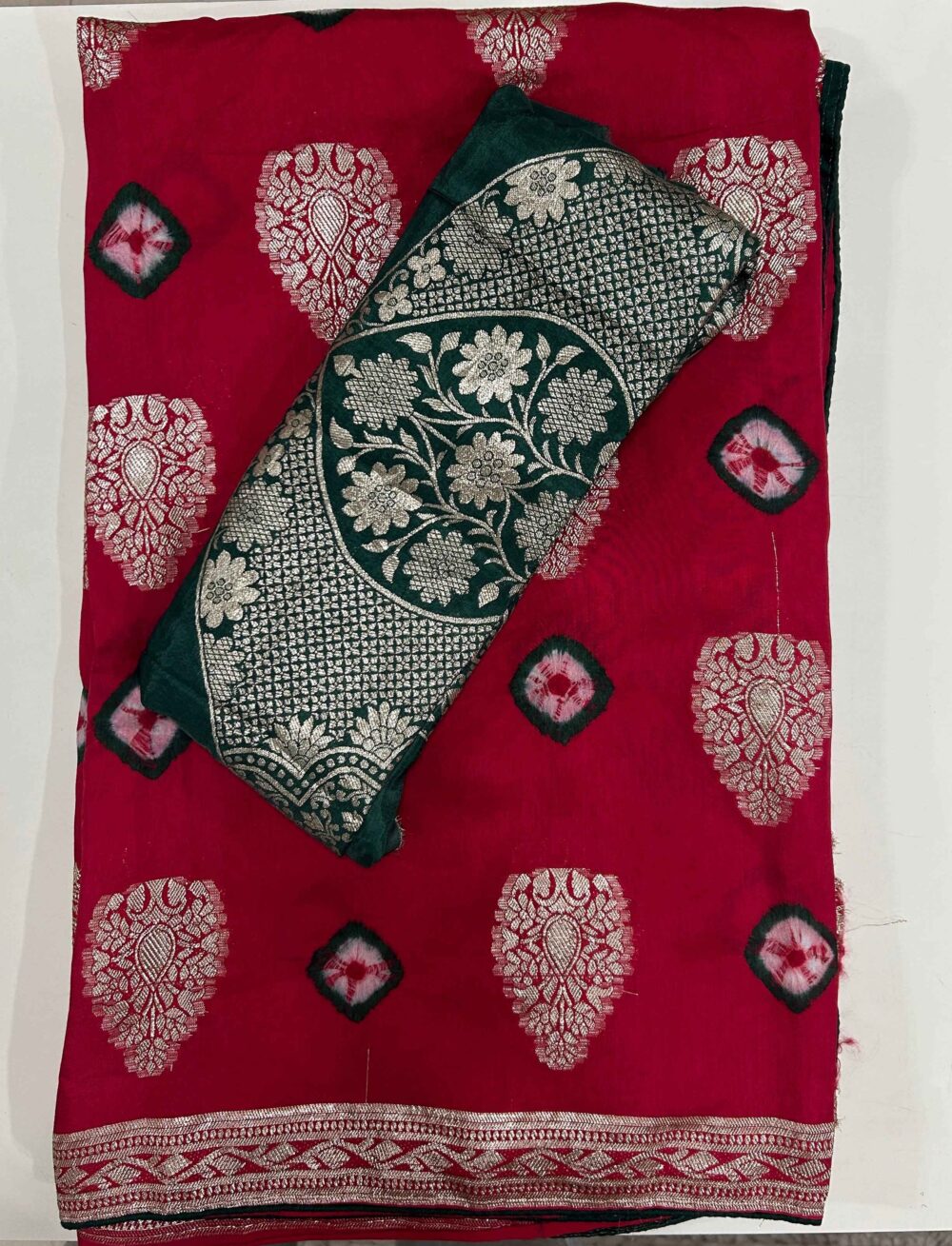 Radiate elegance and grace in this blend of Bandhej Banarsi with heavy work on Blouse as well.