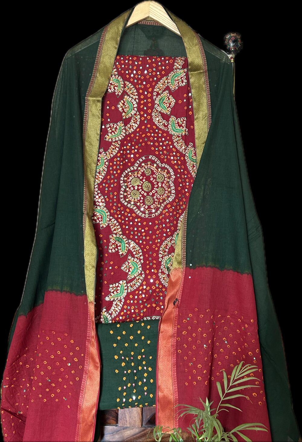 Enhance your wardrobe with our Kutch Bandhej suits in vibrant colour. Handcrafted with precision, it showcases traditional Bandhani tie-dye patterns in vibrant hues, complemented by Kutch handwork. Perfect for both casual and festive wear, this suit set effortlessly adds elegance and cultural charm to any outfit.