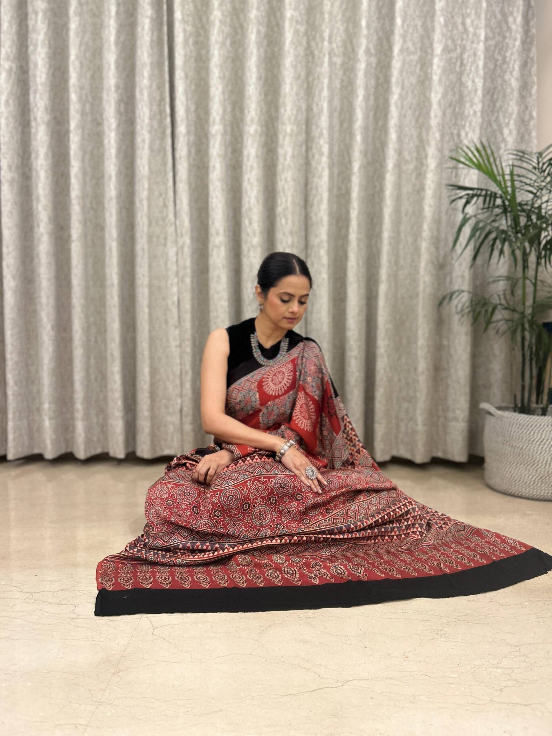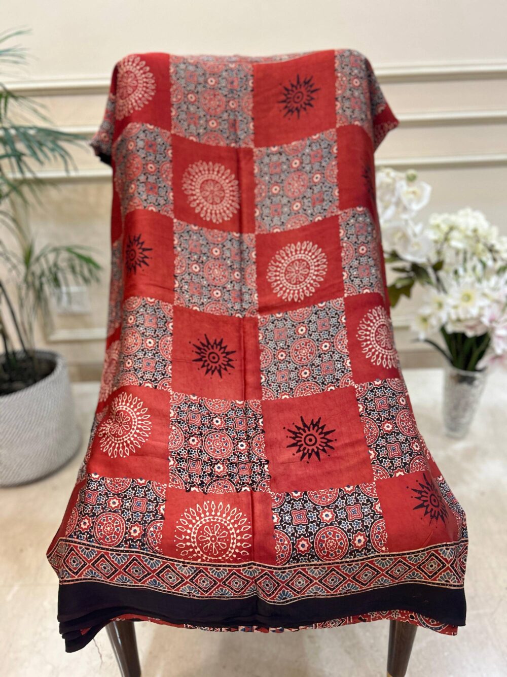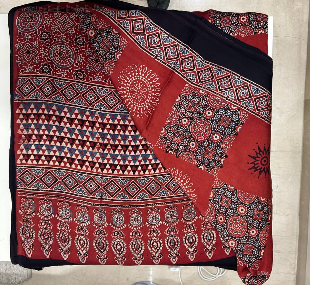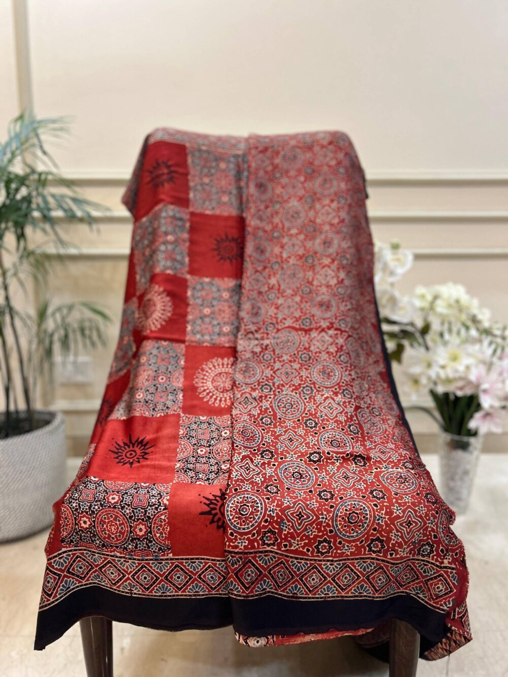 Ajrakh Hand Block Printed Modal Silk Saree is a blend of traditional hand block printing techniques, specifically Ajrakh, with the luxurious and smooth texture of modal silk fabric. Modal Silk Fabric : Modal silk is a blend of modal and silk fibers. Modal is a type of rayon made from beech tree pulp, known for its softness and breathability. Silk, a luxurious and smooth natural fiber, enhances the sheen and overall elegance of the fabric. The combination of modal and silk results in a fabric that is not only soft and comfortable but also has a beautiful drape and luster.