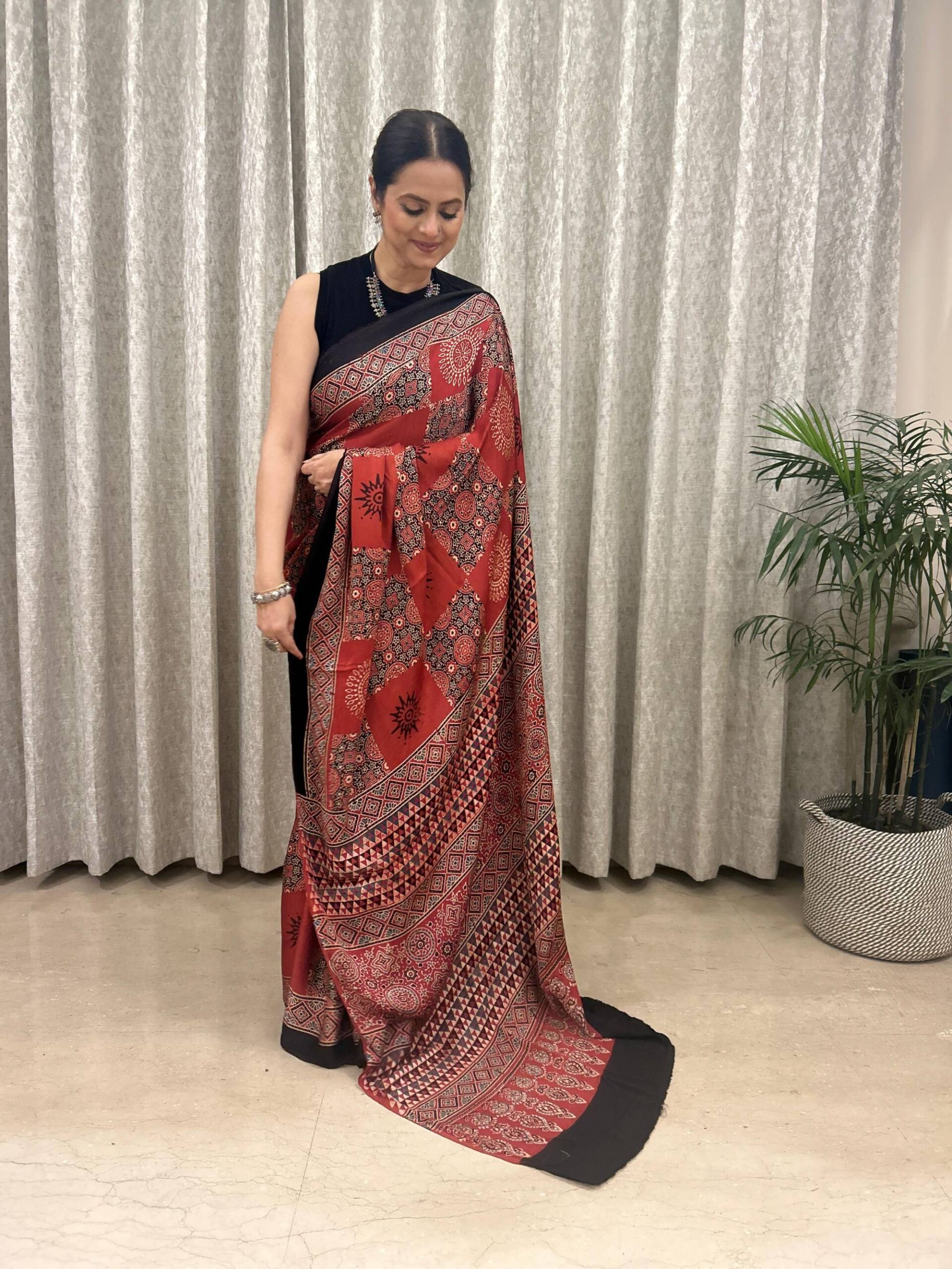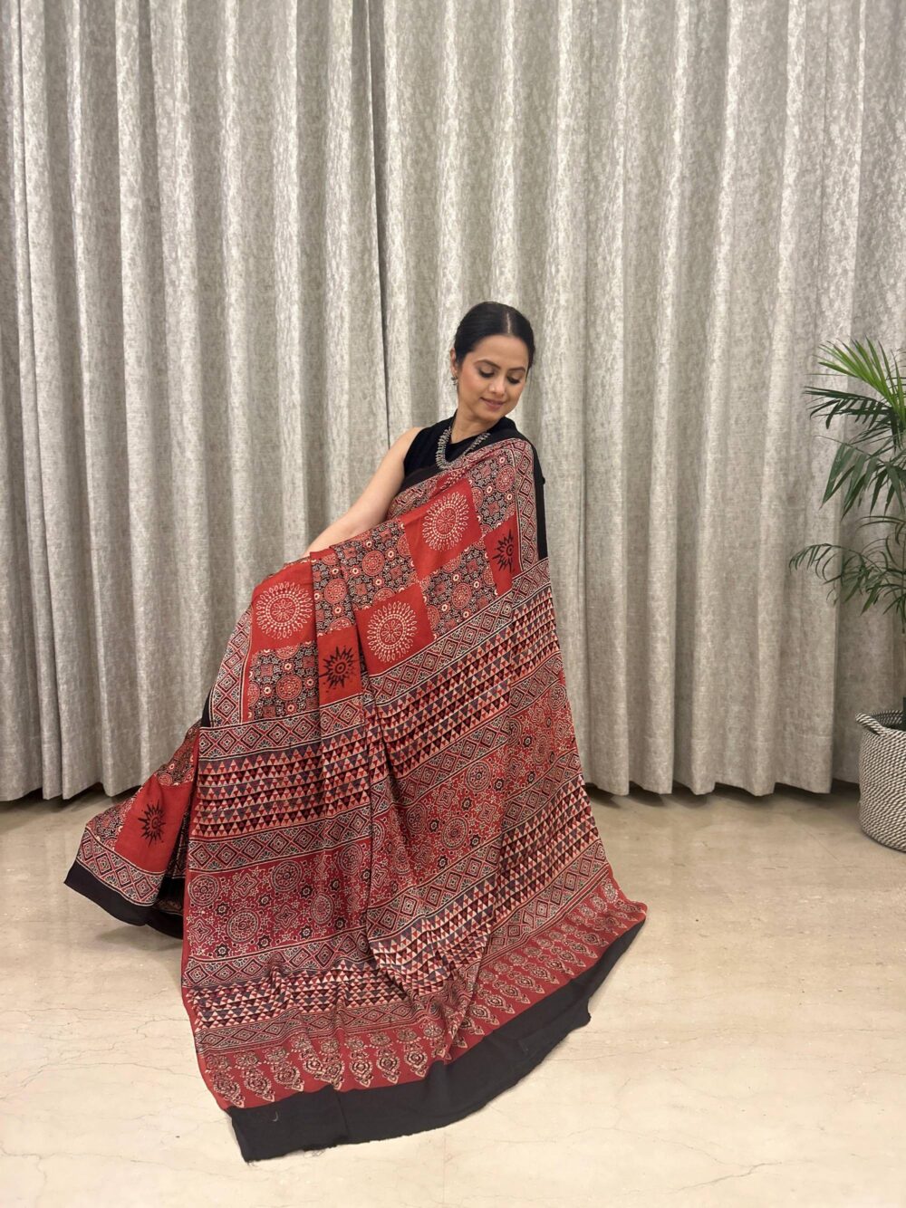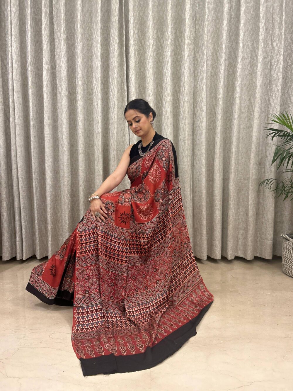 Ajrakh Hand Block Printed Modal Silk Saree is a blend of traditional hand block printing techniques, specifically Ajrakh, with the luxurious and smooth texture of modal silk fabric. Modal Silk Fabric : Modal silk is a blend of modal and silk fibers. Modal is a type of rayon made from beech tree pulp, known for its softness and breathability. Silk, a luxurious and smooth natural fiber, enhances the sheen and overall elegance of the fabric. The combination of modal and silk results in a fabric that is not only soft and comfortable but also has a beautiful drape and luster.