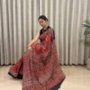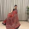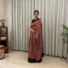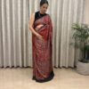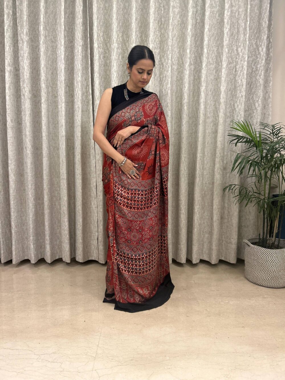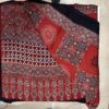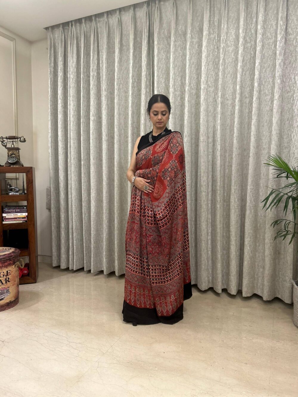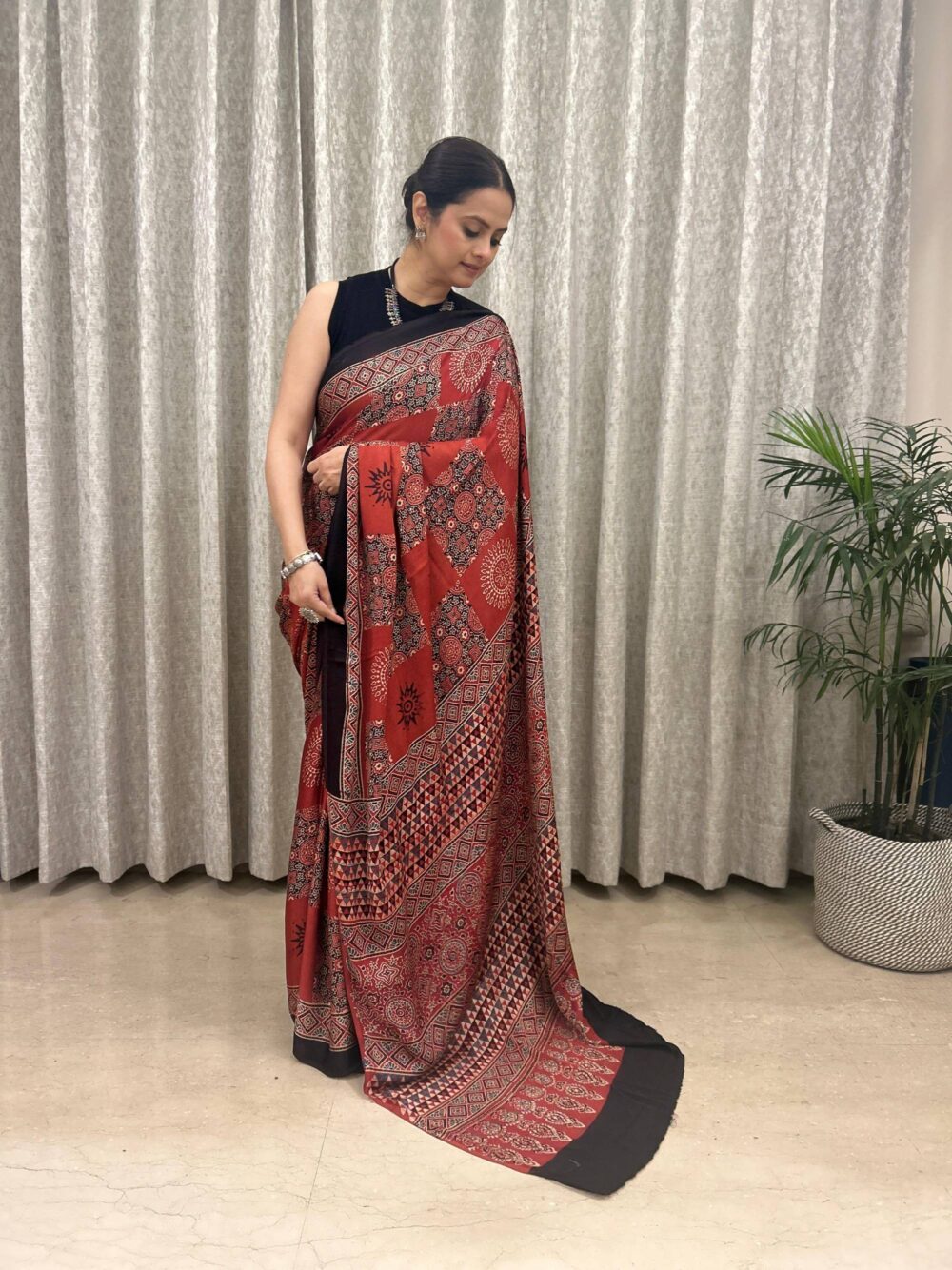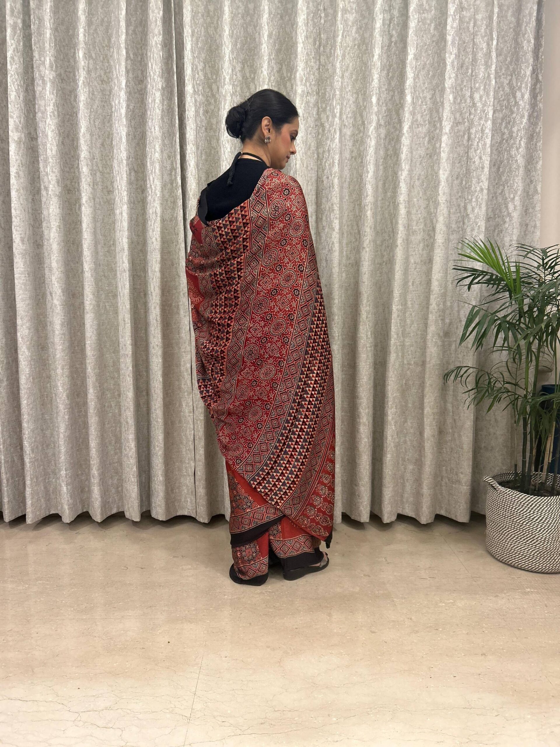 Ajrakh Hand Block Printed Modal Silk Saree is a blend of traditional hand block printing techniques, specifically Ajrakh, with the luxurious and smooth texture of modal silk fabric. Modal Silk Fabric : Modal silk is a blend of modal and silk fibers. Modal is a type of rayon made from beech tree pulp, known for its softness and breathability. Silk, a luxurious and smooth natural fiber, enhances the sheen and overall elegance of the fabric. The combination of modal and silk results in a fabric that is not only soft and comfortable but also has a beautiful drape and luster.