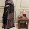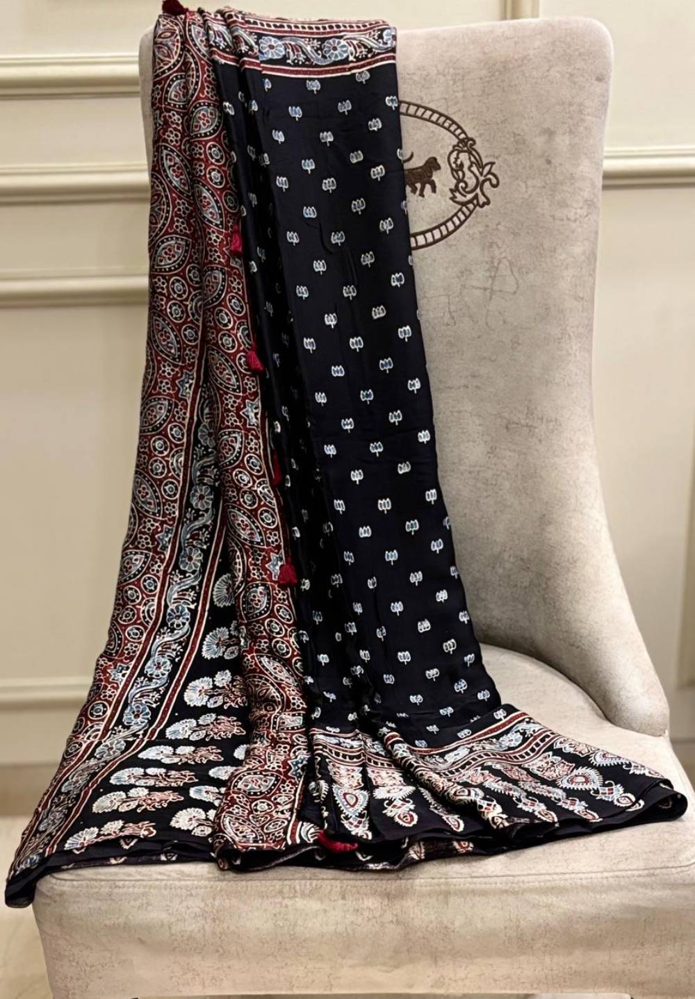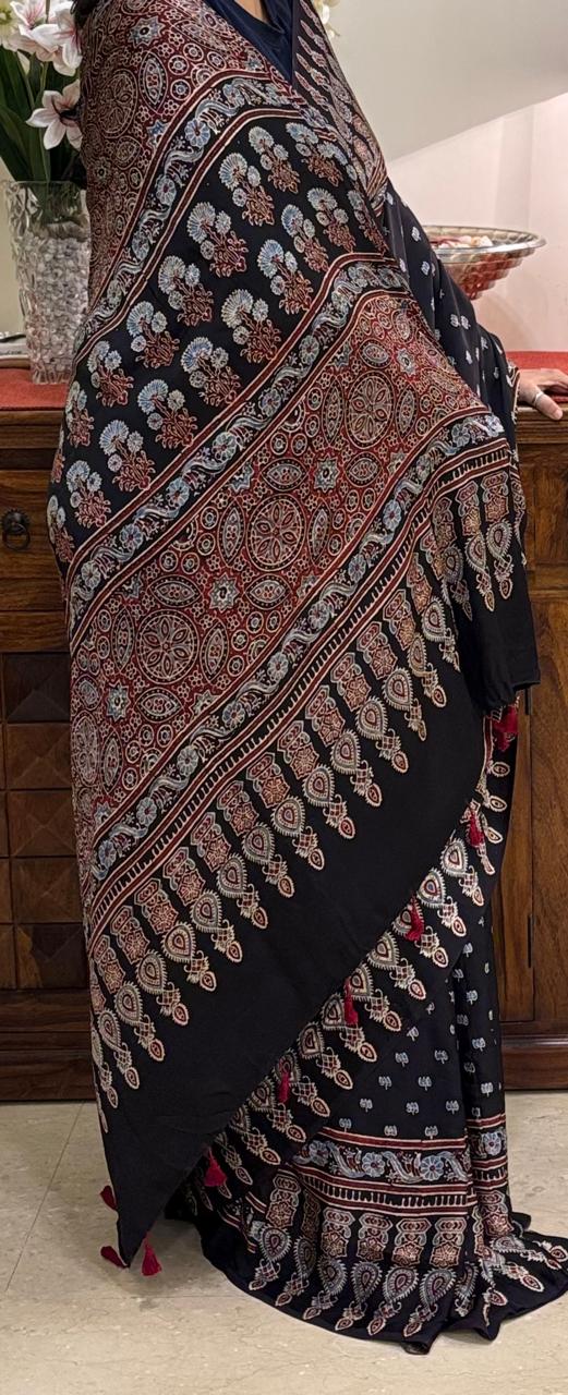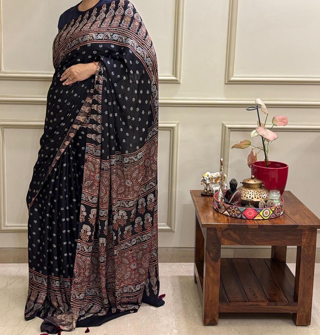 Bagru & Ajrakh Hand Block Printed Modal Silk Saree. Modal Silk Saree is a blend of traditional hand block printing techniques, specifically Ajrakh, with the luxurious and smooth texture of modal silk fabric. Modal Silk Fabric : Modal silk is a blend of modal and silk fibers. Modal is a type of rayon made from beech tree pulp, known for its softness and breathability. Silk, a luxurious and smooth natural fiber, enhances the sheen and overall elegance of the fabric. The combination of modal and silk results in a fabric that is not only soft and comfortable but also has a beautiful drape and luster.