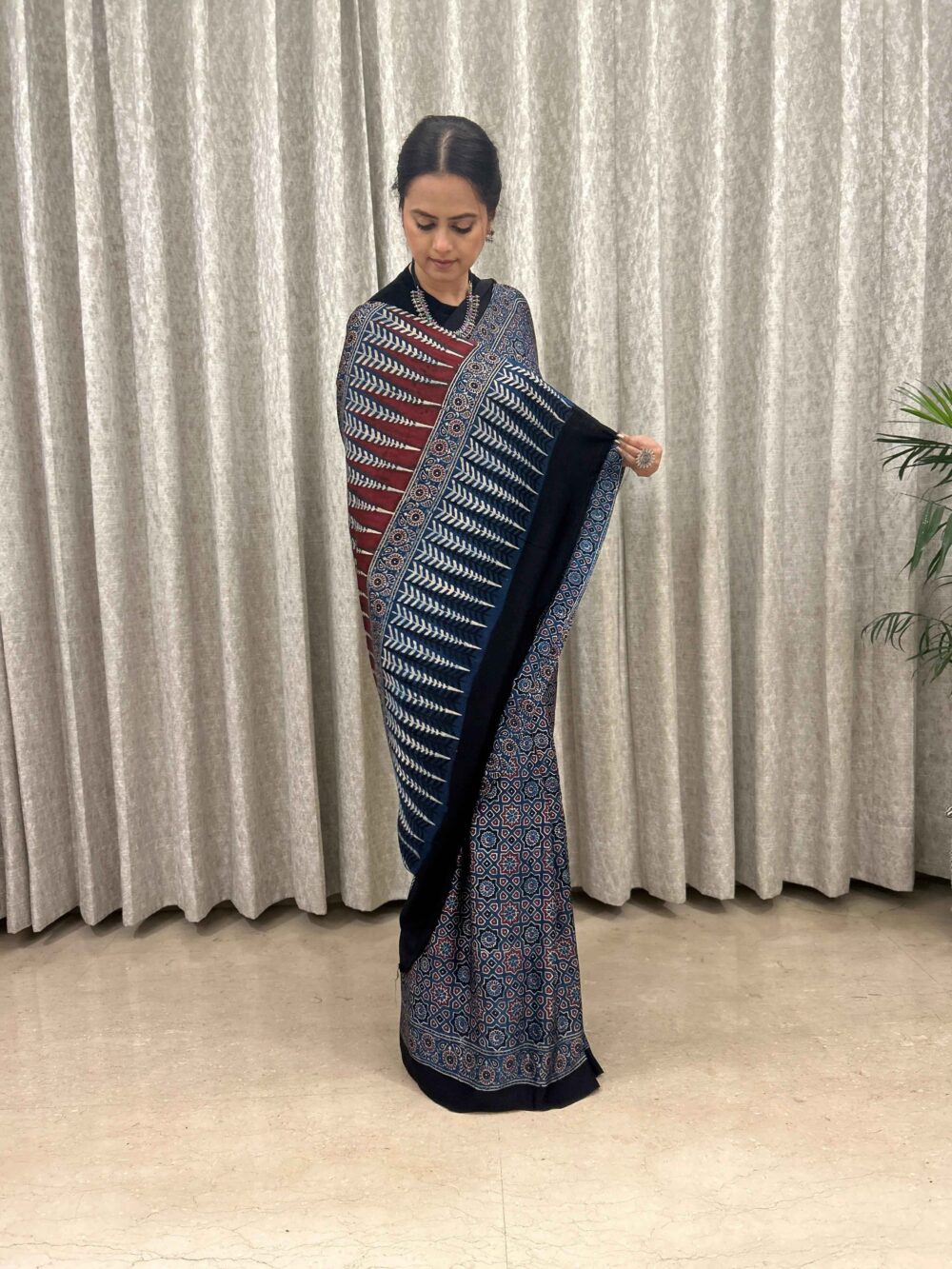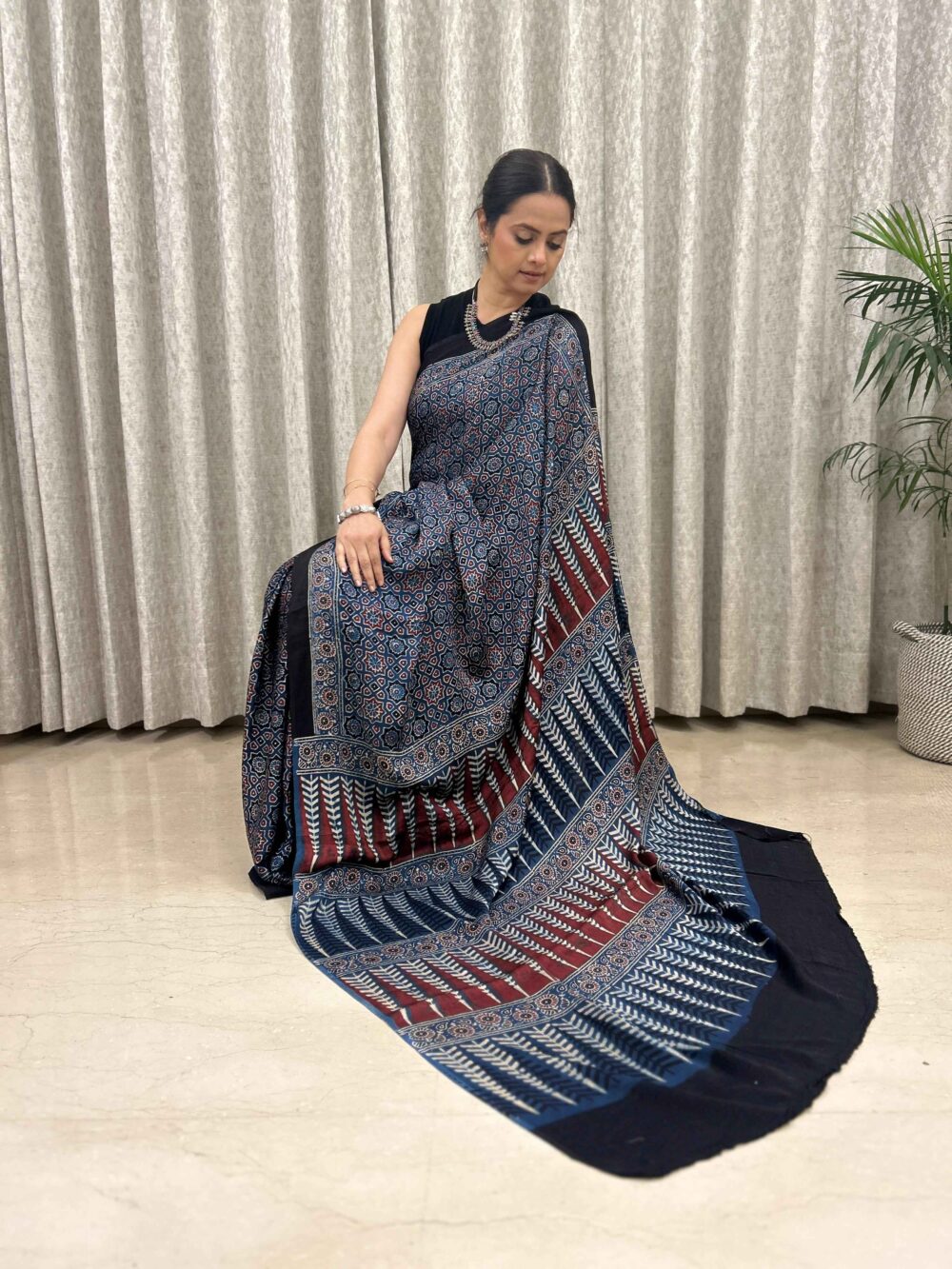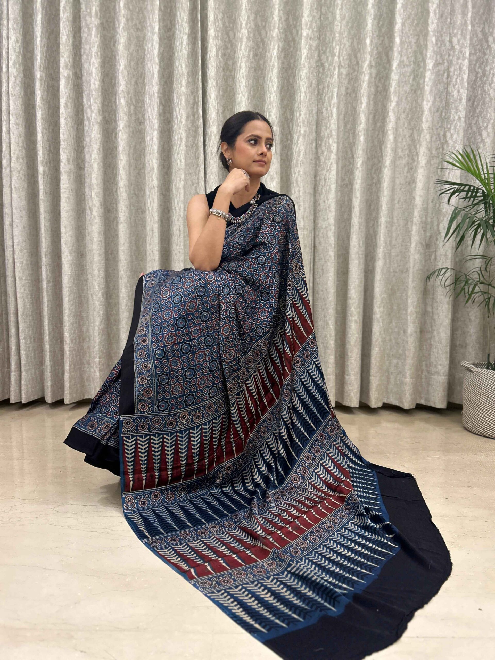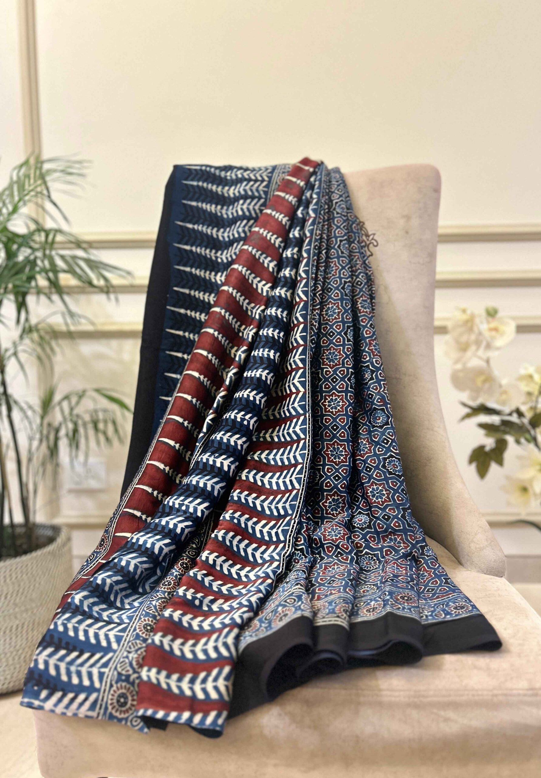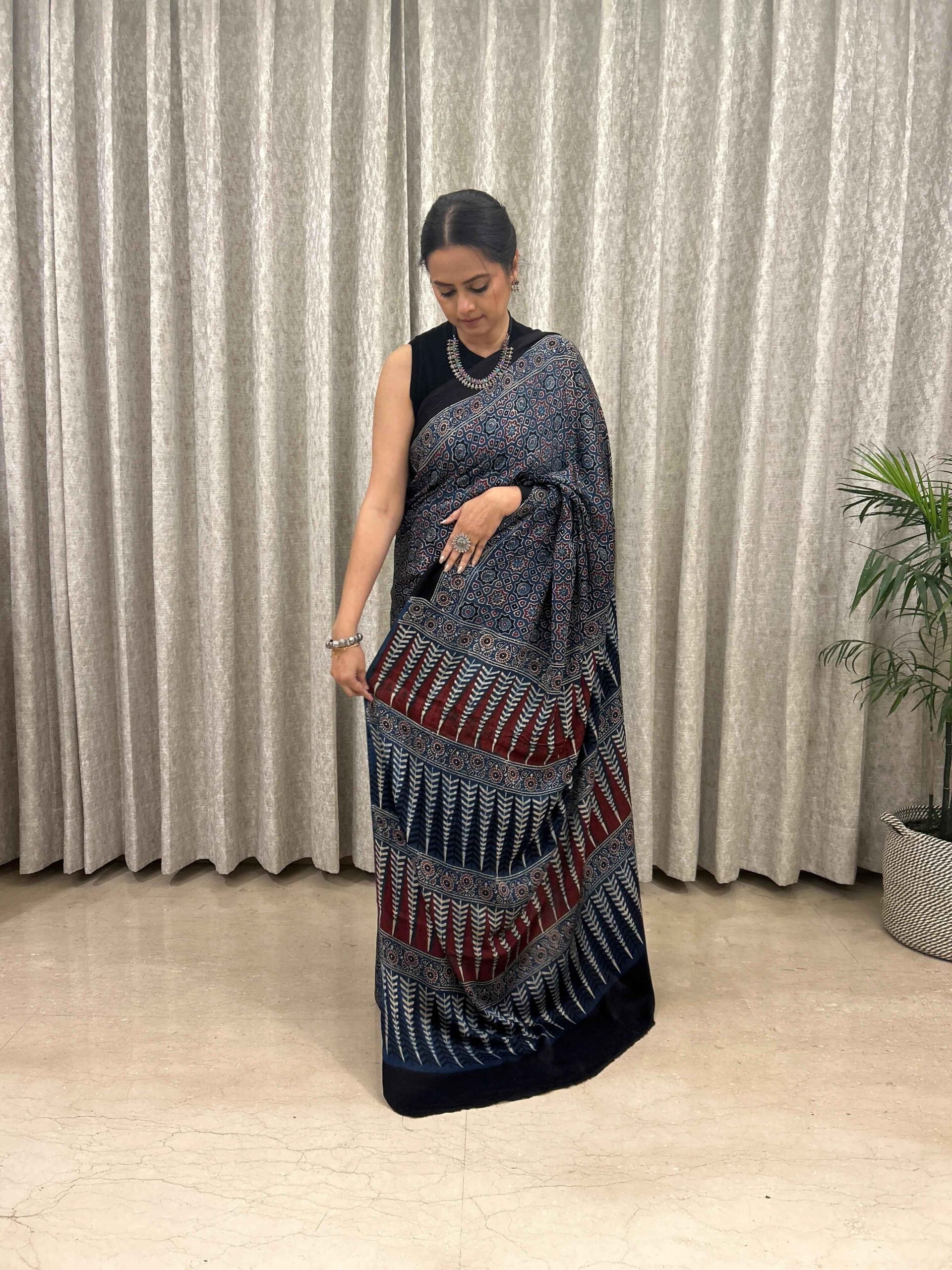 Ajrakh Hand Block Printed Modal Silk Saree is a blend of traditional hand block printing techniques, specifically Ajrakh, with the luxurious and smooth texture of modal silk fabric.