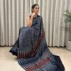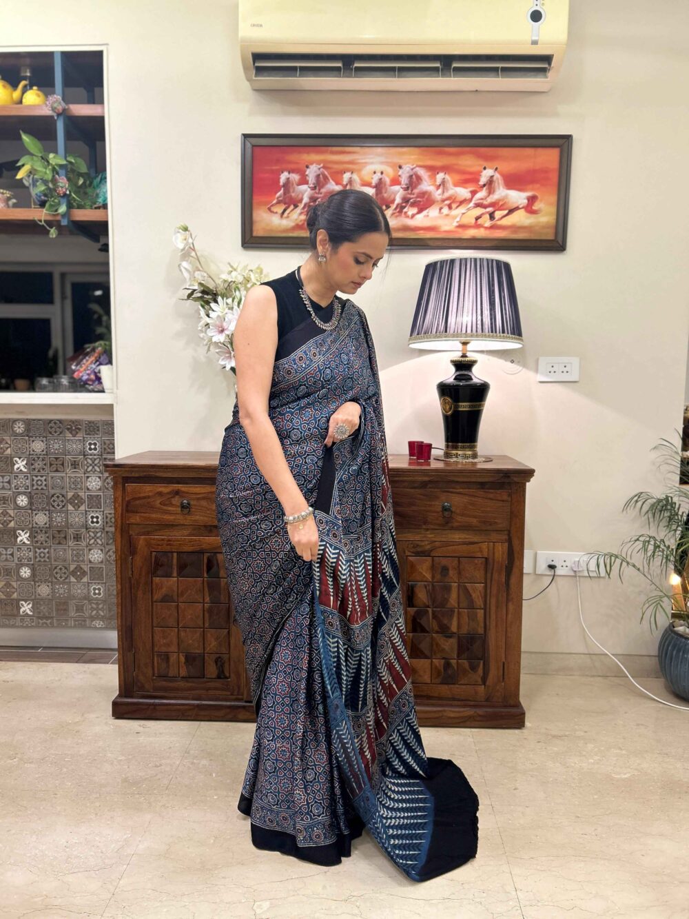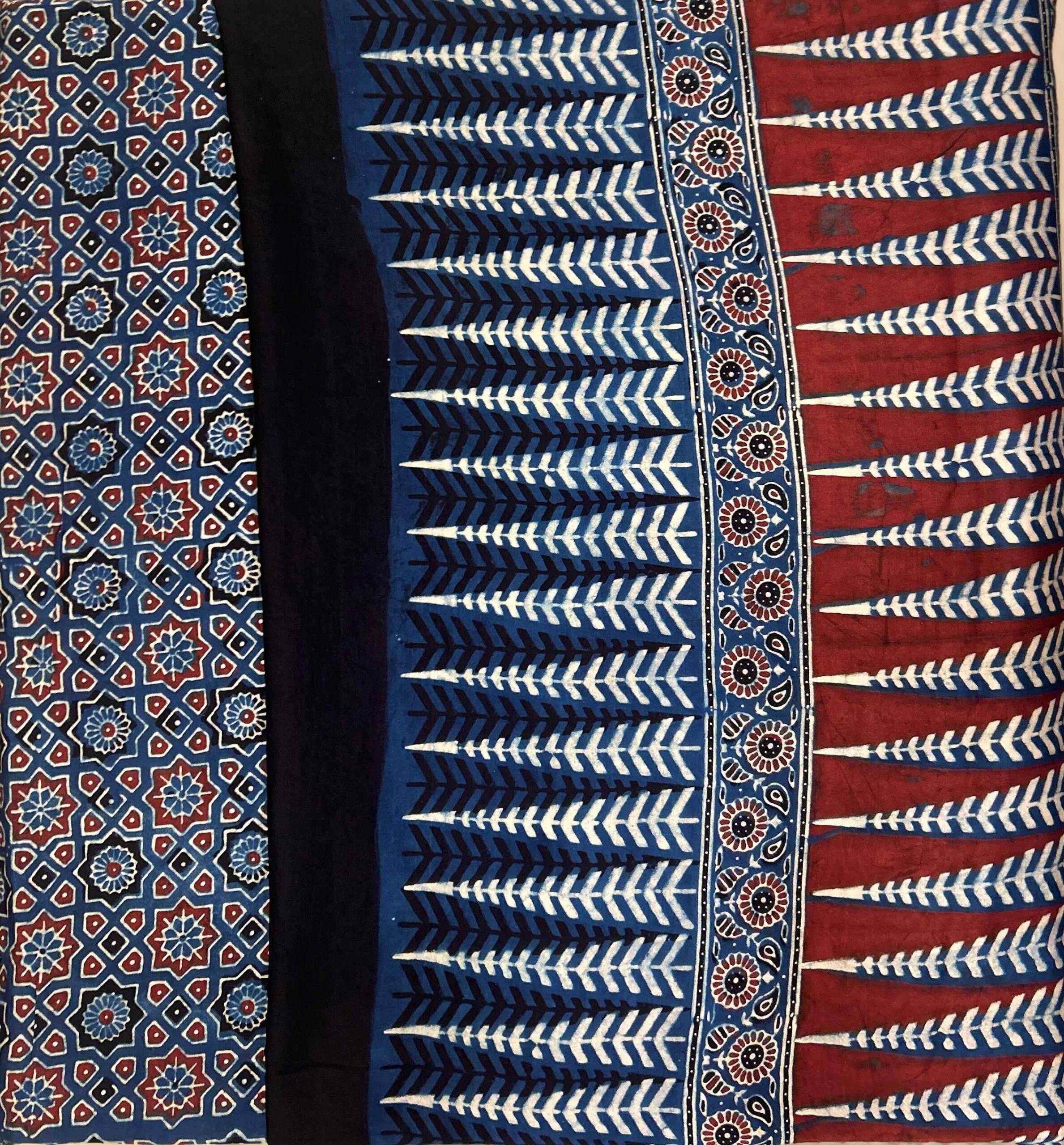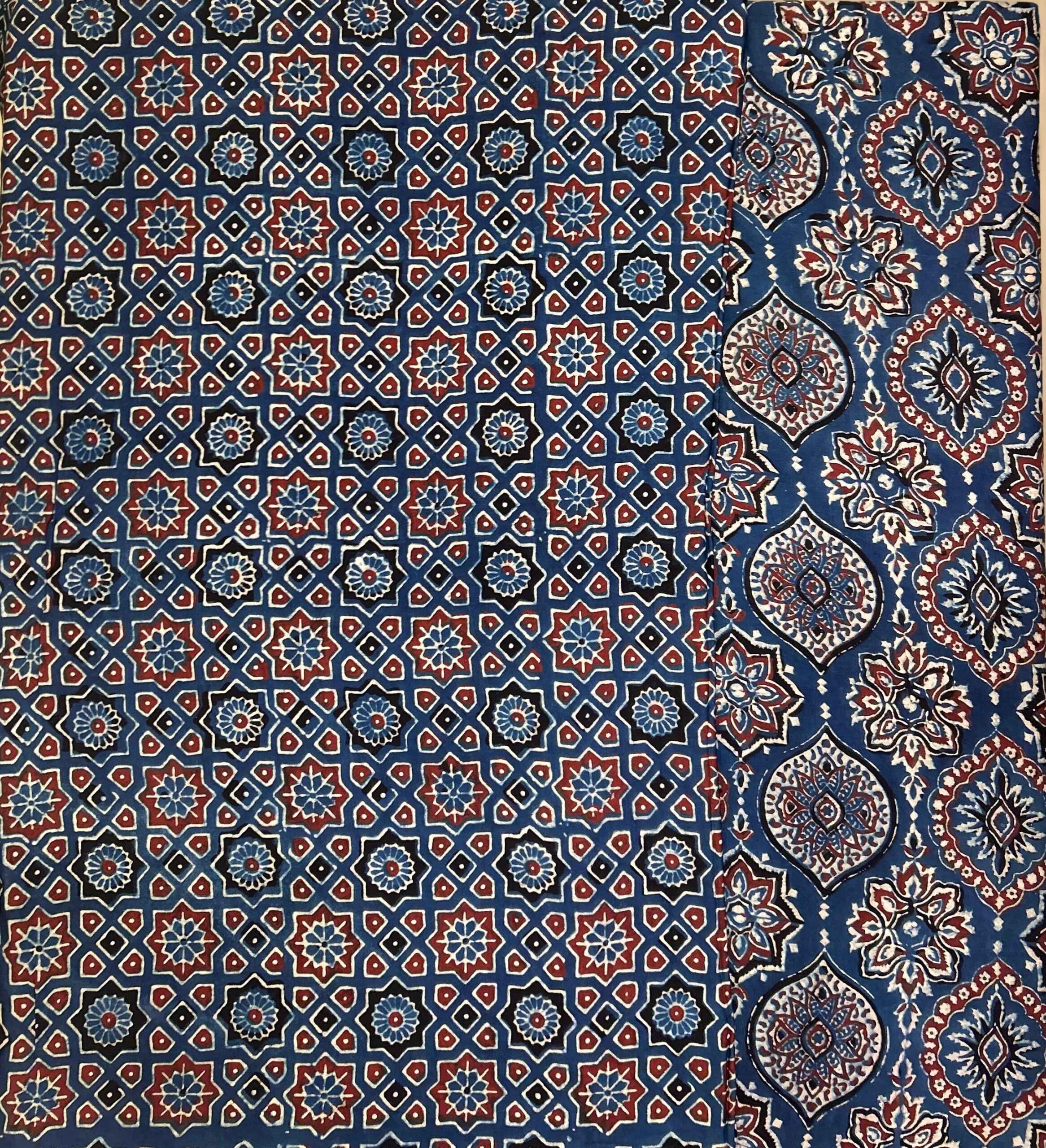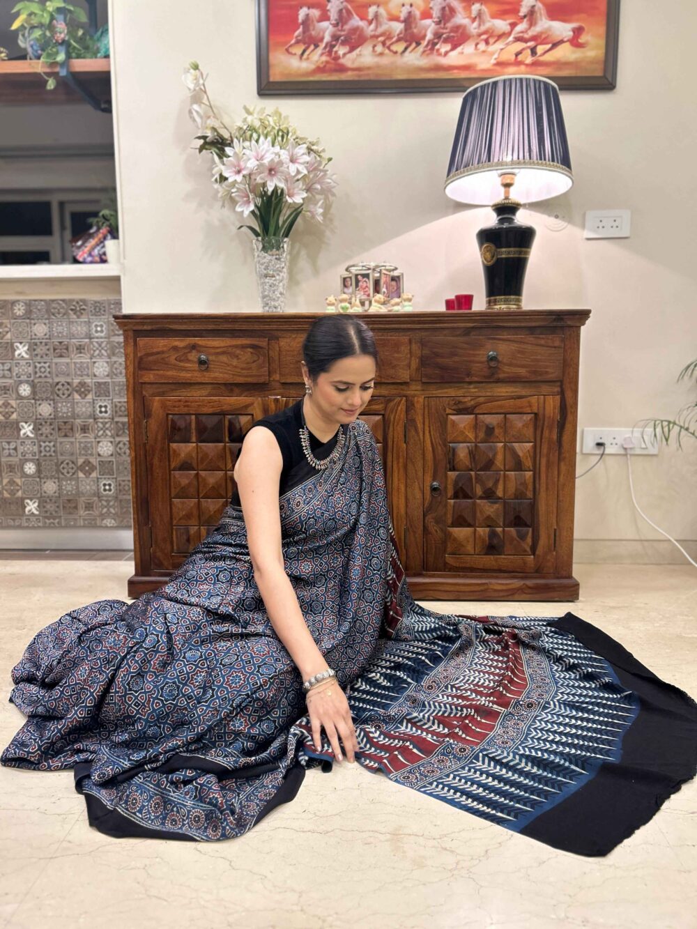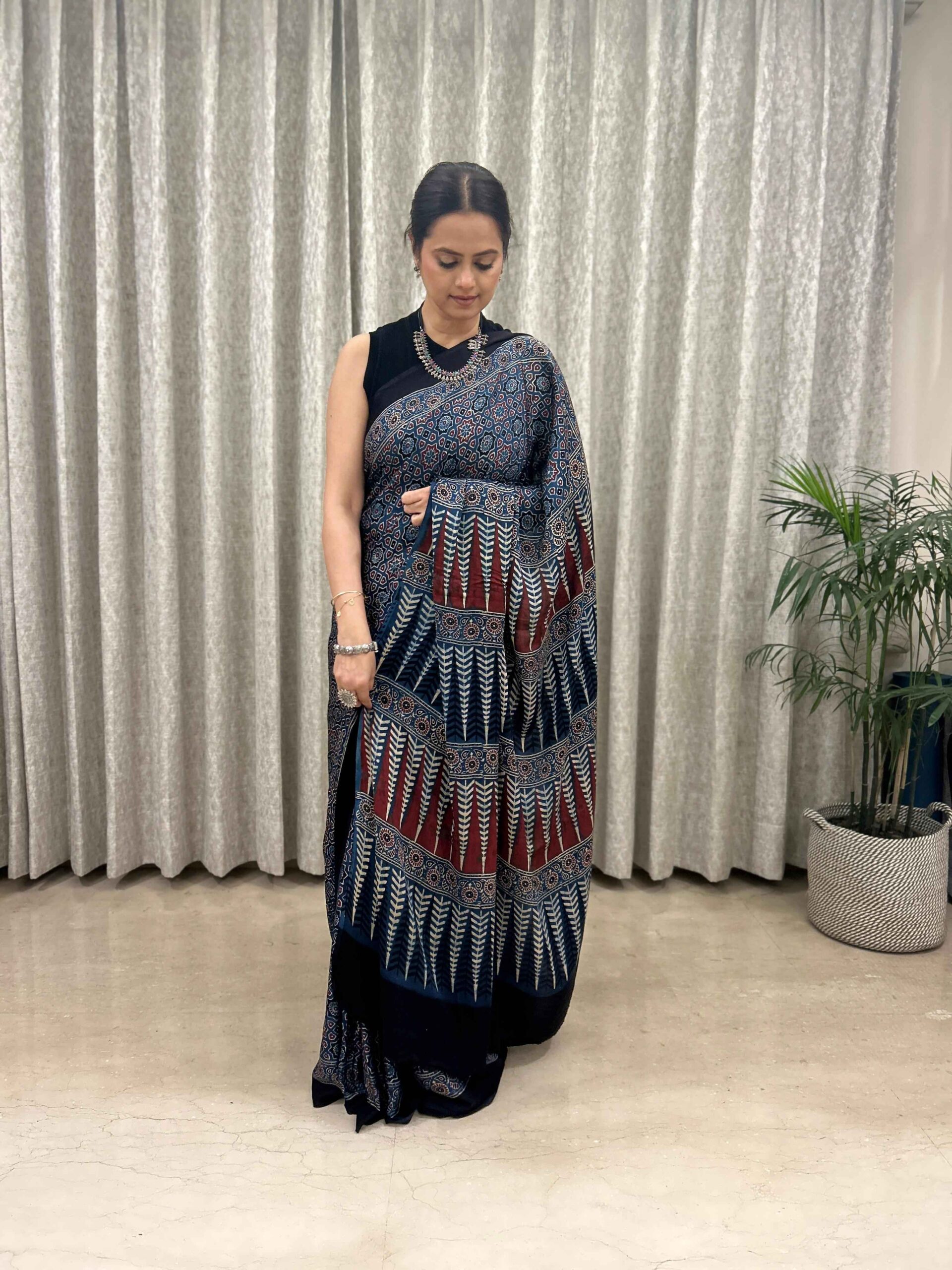Ajrakh Hand Block Printed Modal Silk Saree is a blend of traditional hand block printing techniques, specifically Ajrakh, with the luxurious and smooth texture of modal silk fabric.