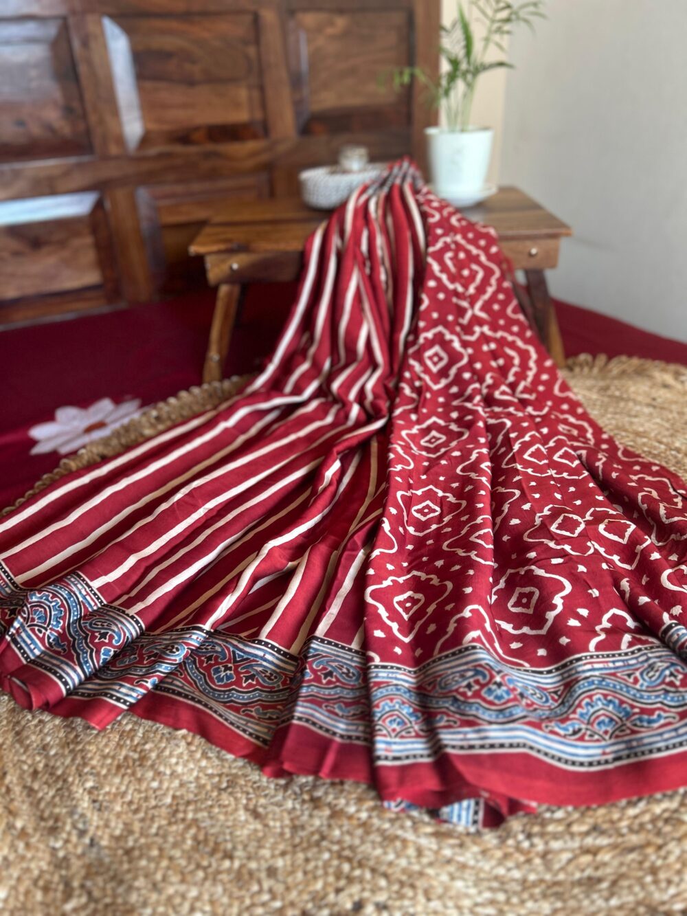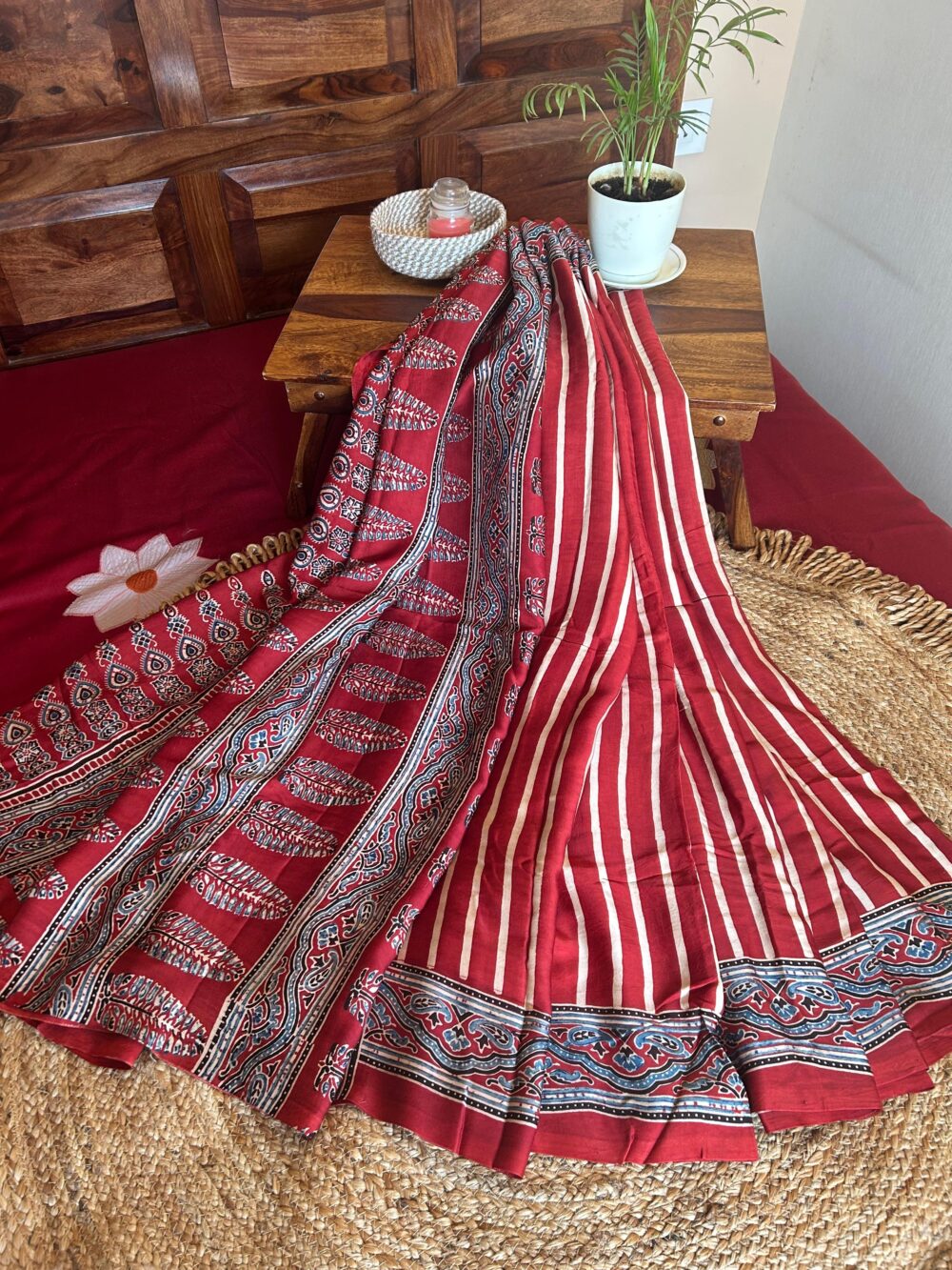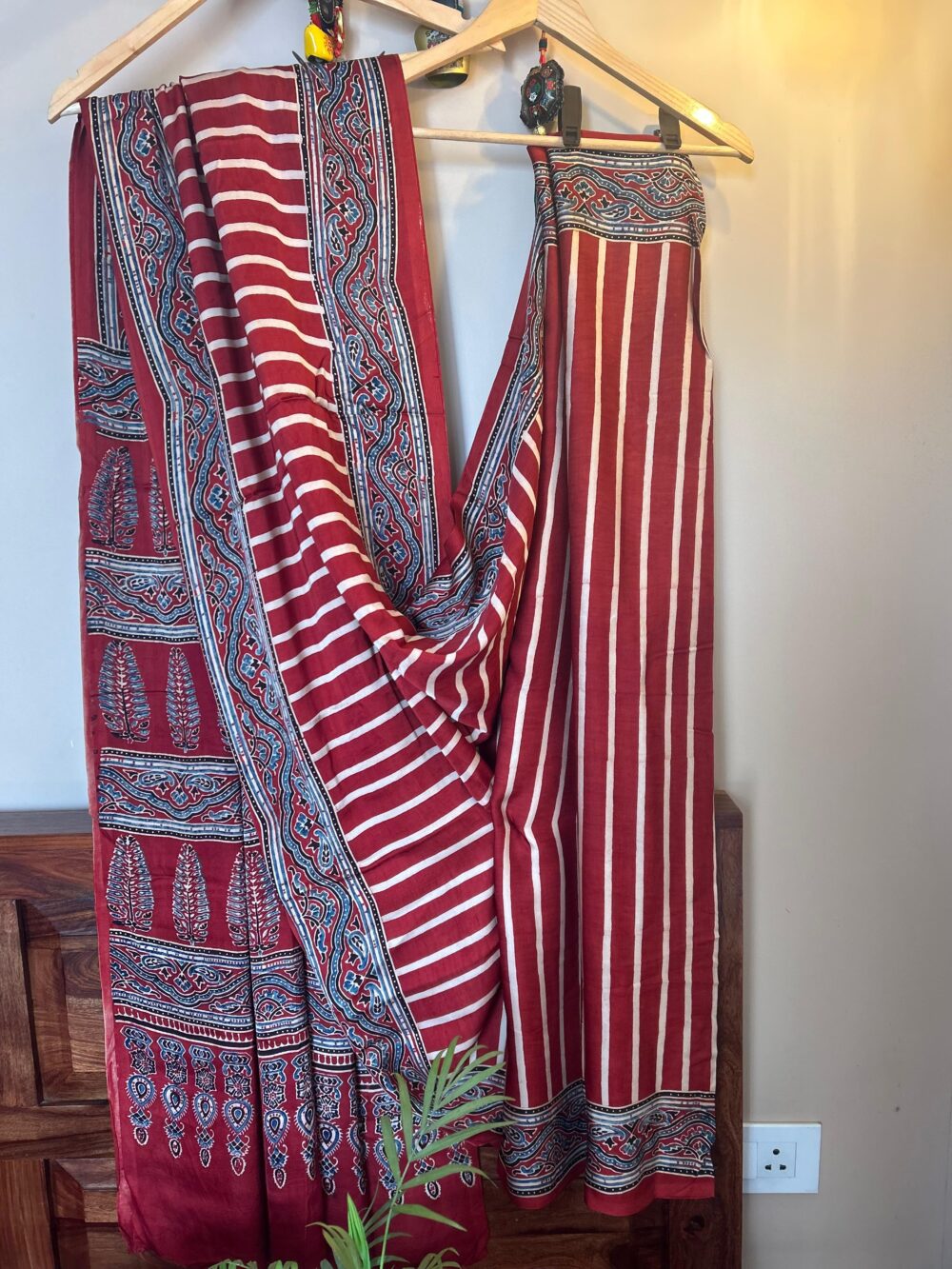 Ajrakh Hand Block Printed Modal Silk Saree is a blend of traditional hand block printing techniques, specifically Ajrakh, with the luxurious and smooth texture of modal silk fabric.
