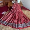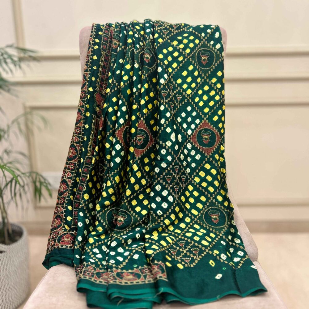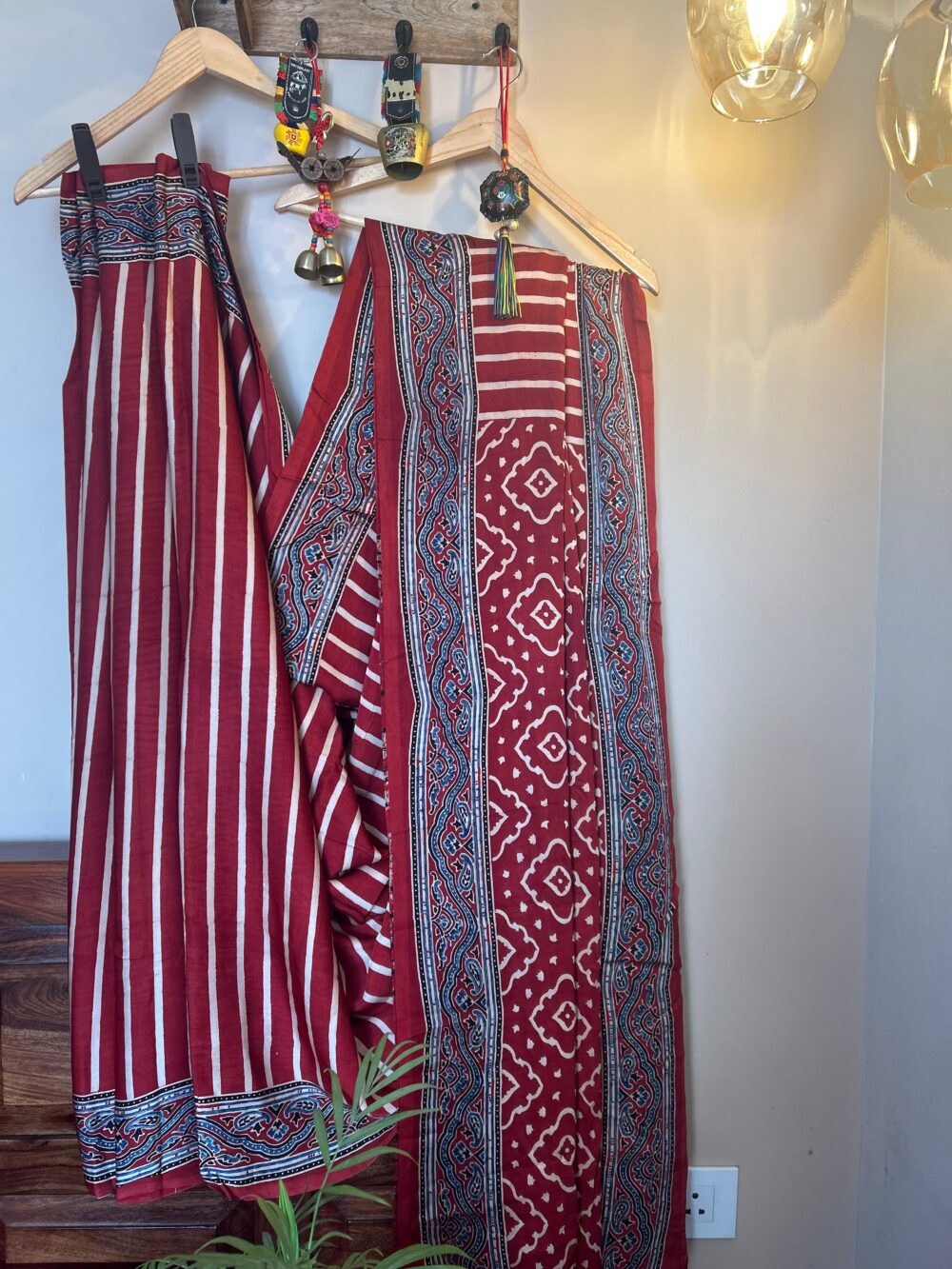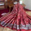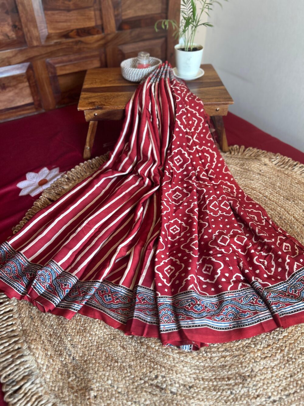 Ajrakh Hand Block Printed Modal Silk Saree is a blend of traditional hand block printing techniques, specifically Ajrakh, with the luxurious and smooth texture of modal silk fabric.