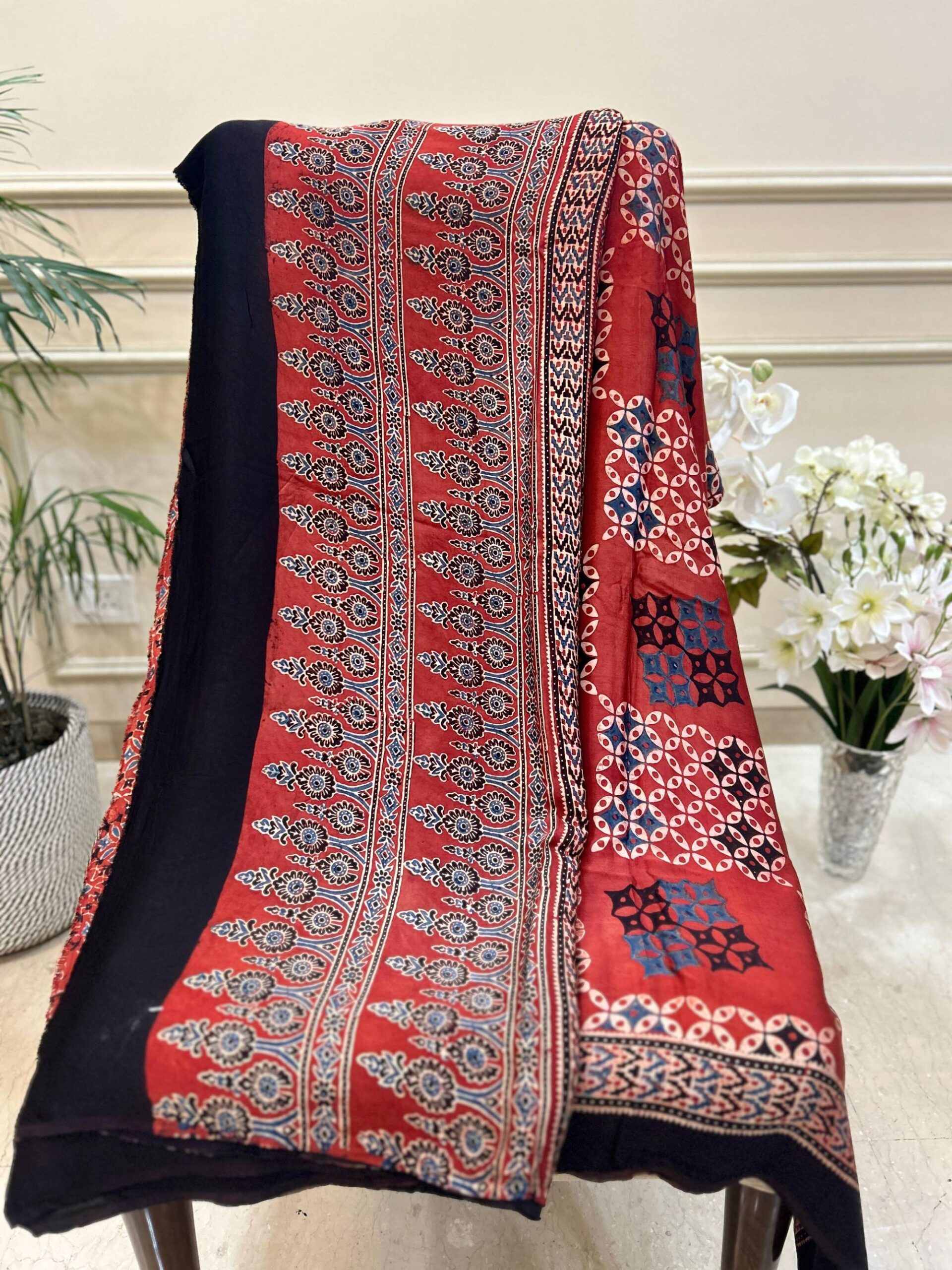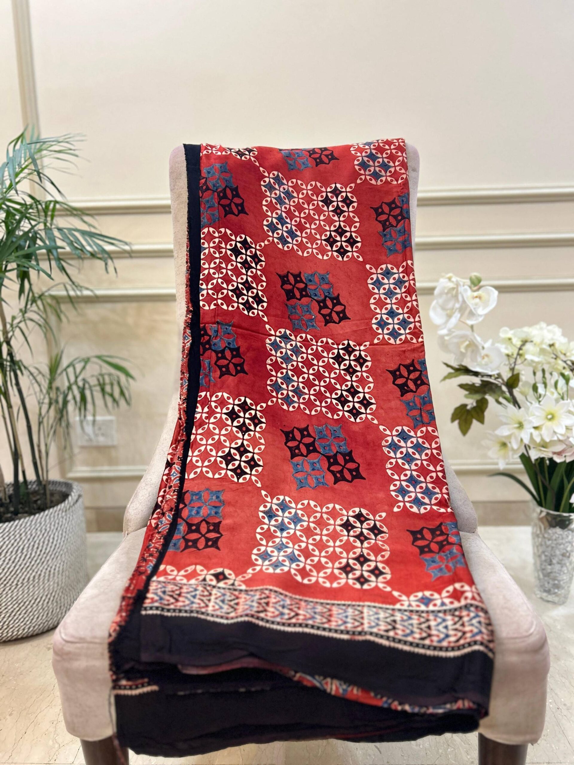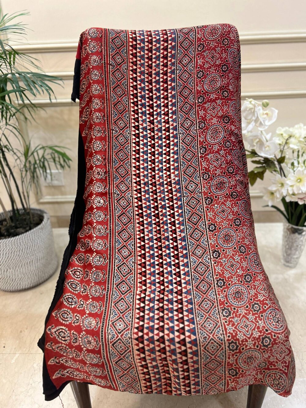 Ajrakh Hand Block Printed Modal Silk Saree is a blend of traditional hand block printing techniques, specifically Ajrakh, with the luxurious and smooth texture of modal silk fabric.