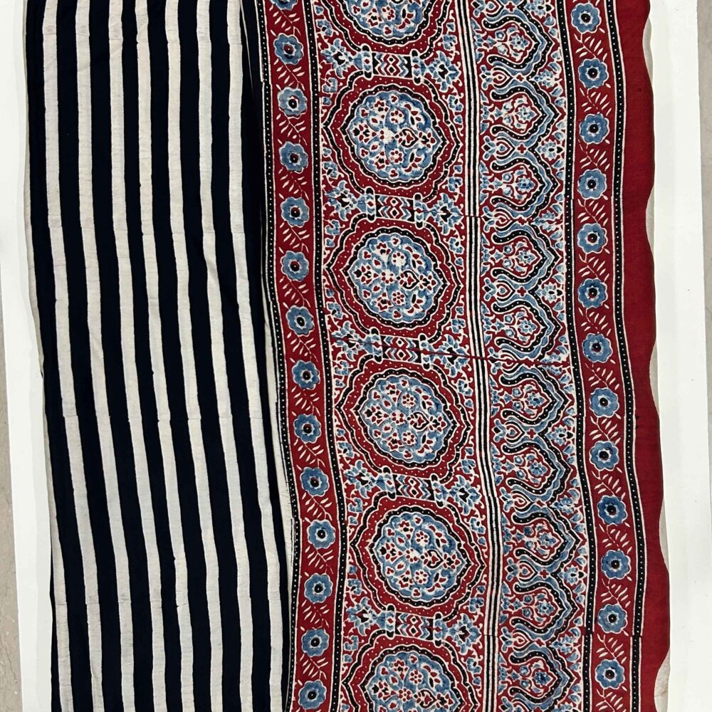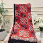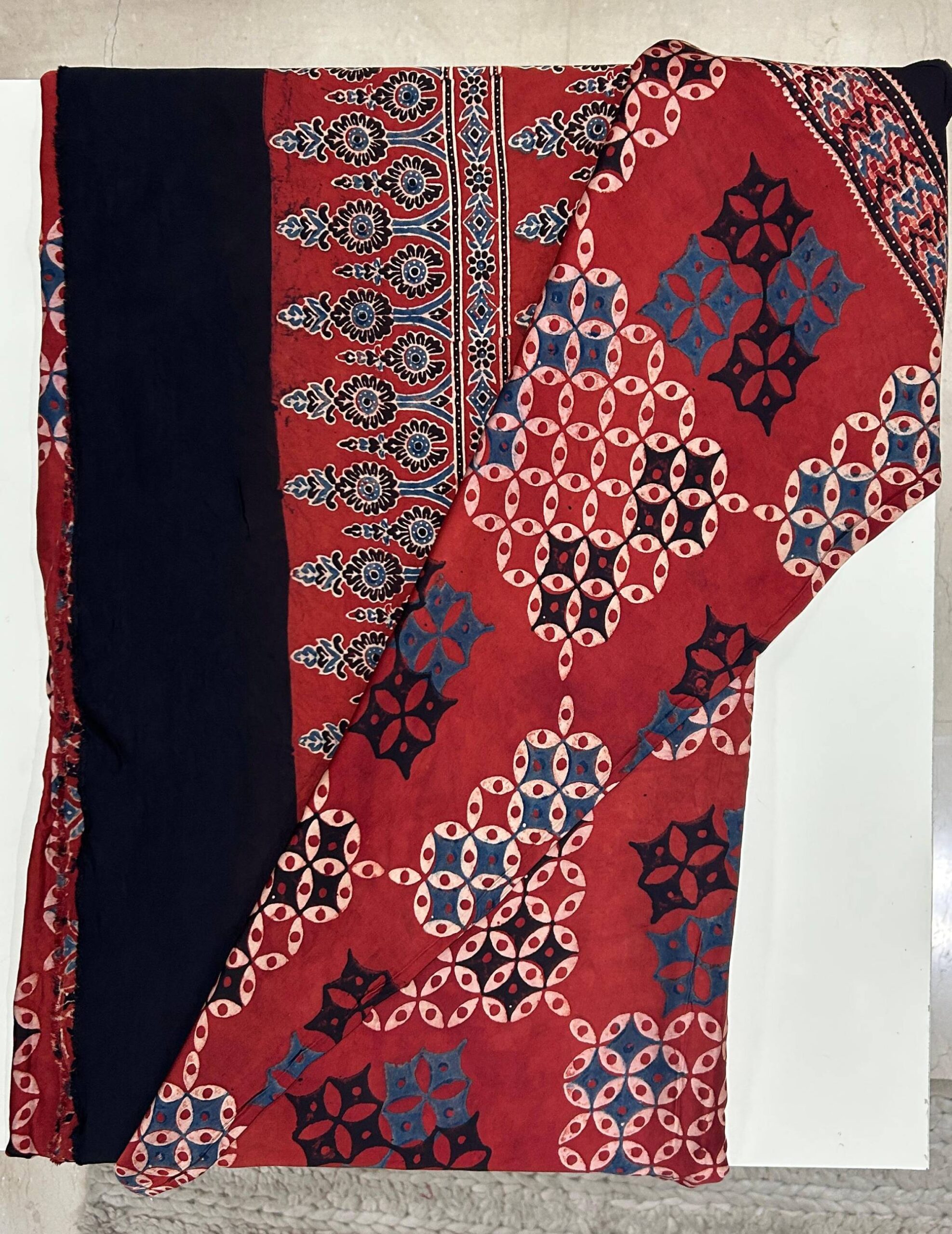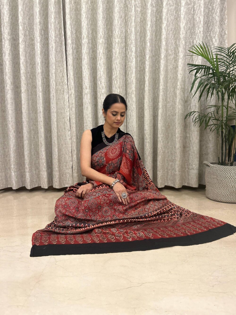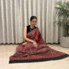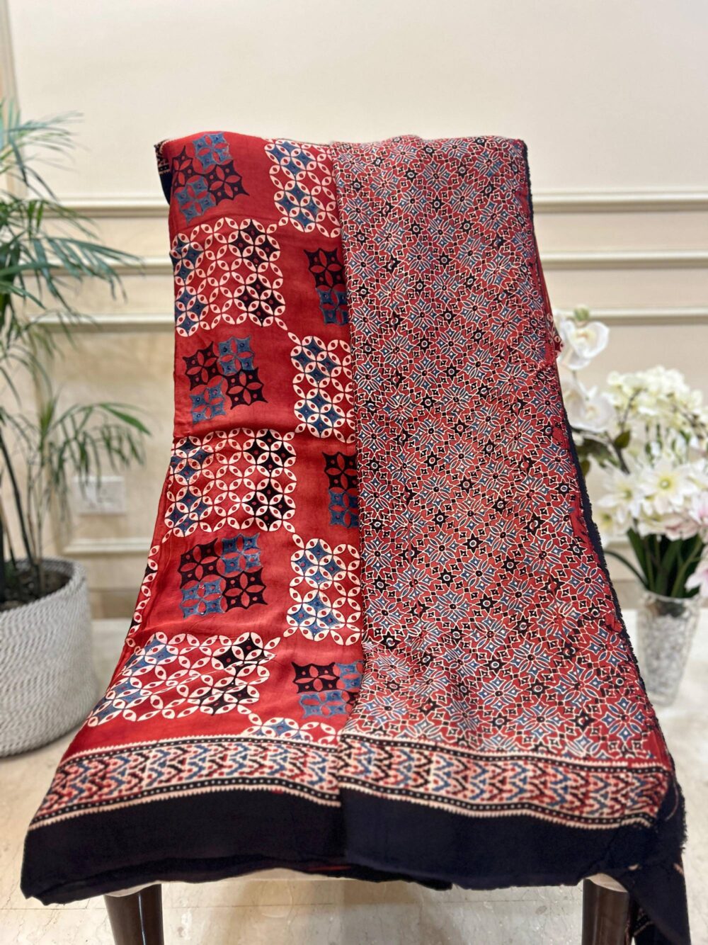 Ajrakh Hand Block Printed Modal Silk Saree is a blend of traditional hand block printing techniques, specifically Ajrakh, with the luxurious and smooth texture of modal silk fabric.