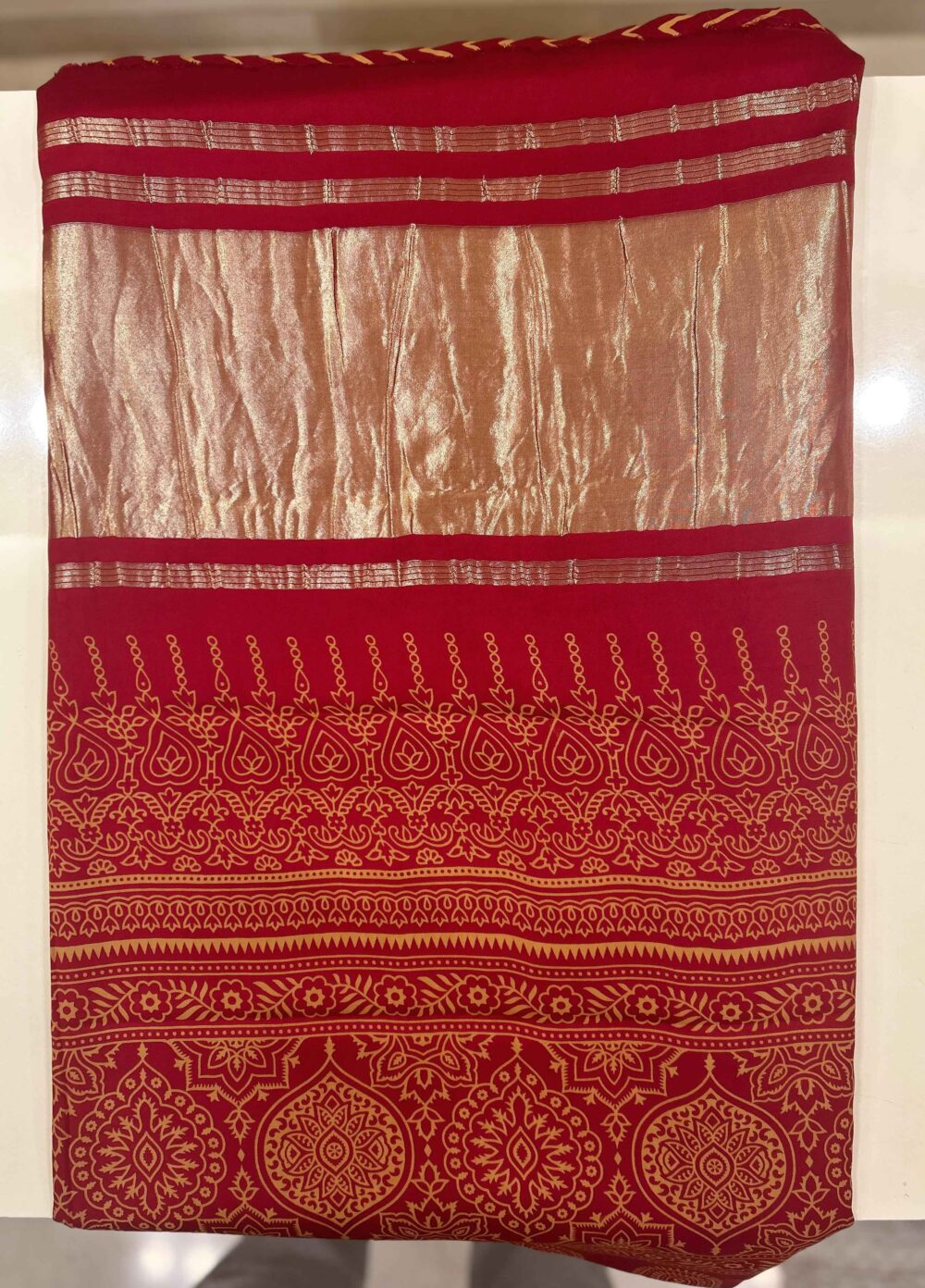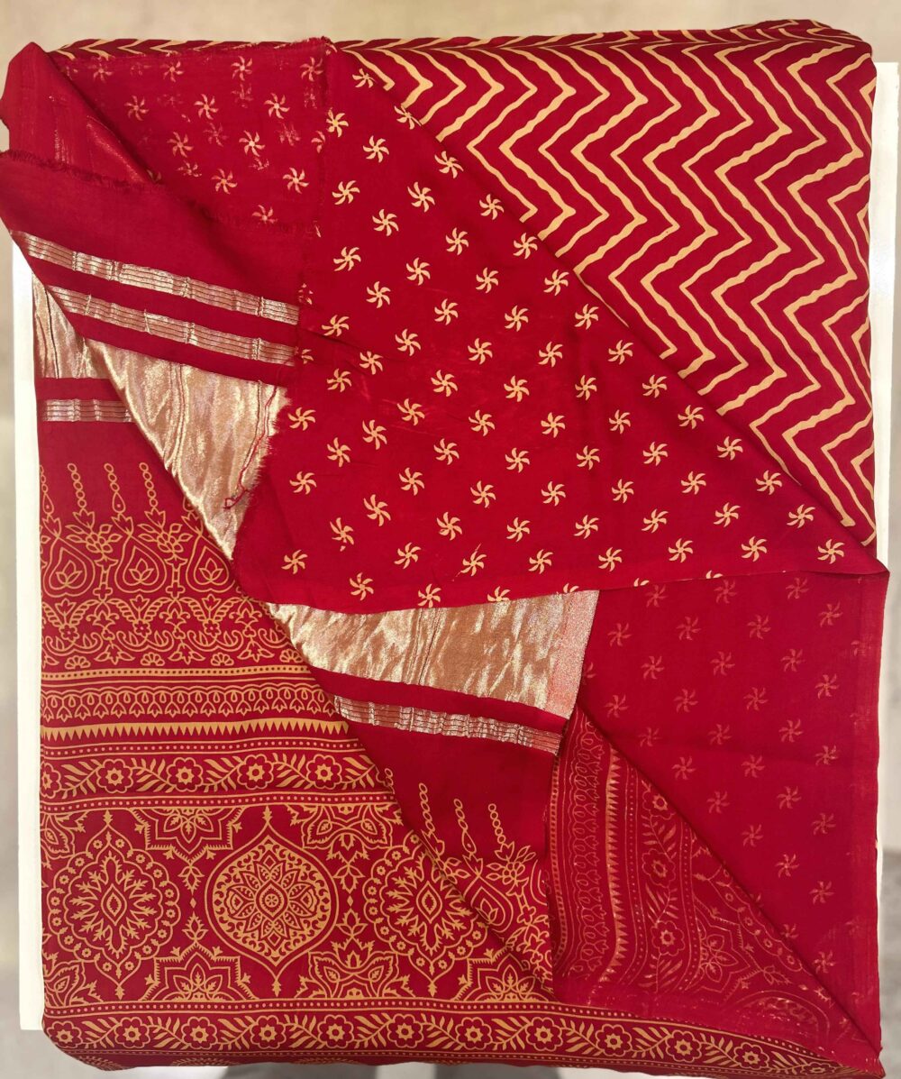 Ajrakh Hand Block Printed Modal Silk Saree is a blend of traditional hand block printing techniques, specifically Ajrakh, with the luxurious and smooth texture of modal silk fabric.