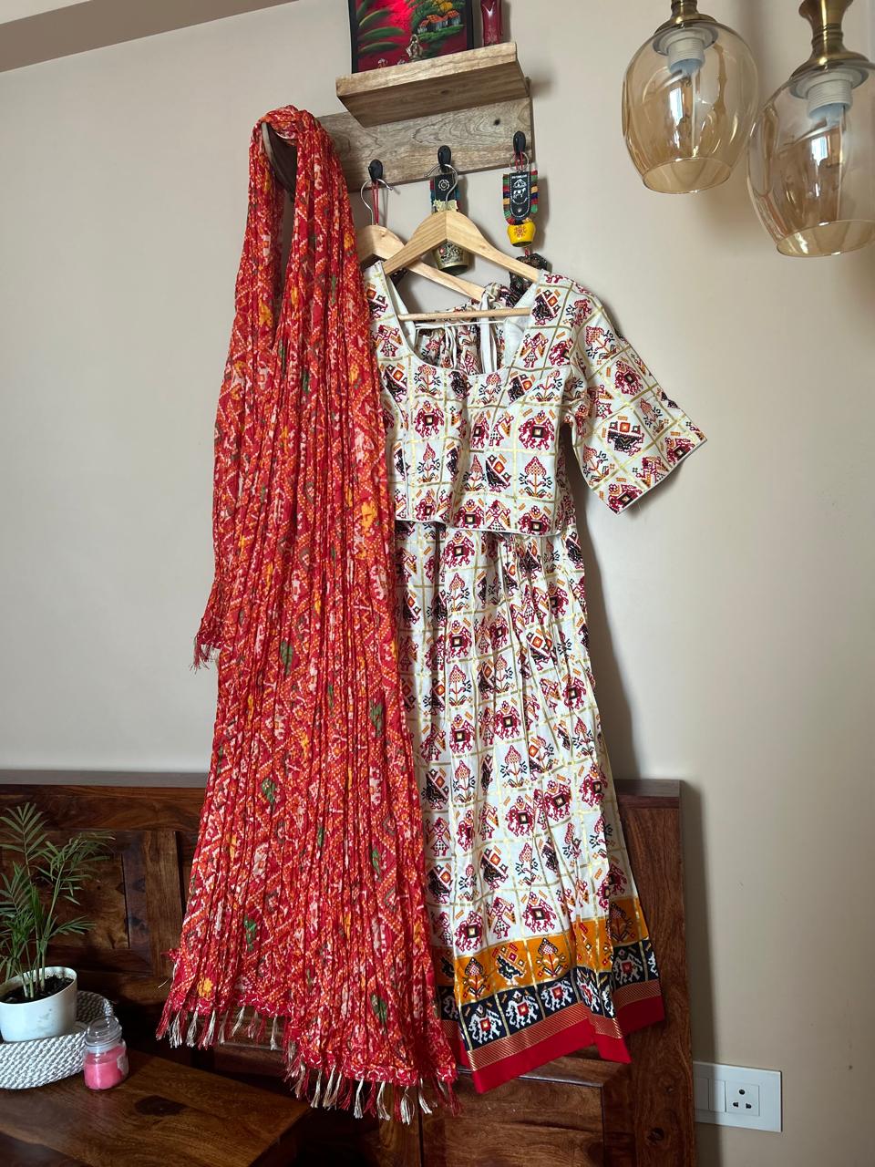 Beautiful Patola style Lehanga set with Bandhani dupatta. It is pre-stitched. The fitting can be done as enough margin is there. These are light weight and can be wore in multiple occasions.